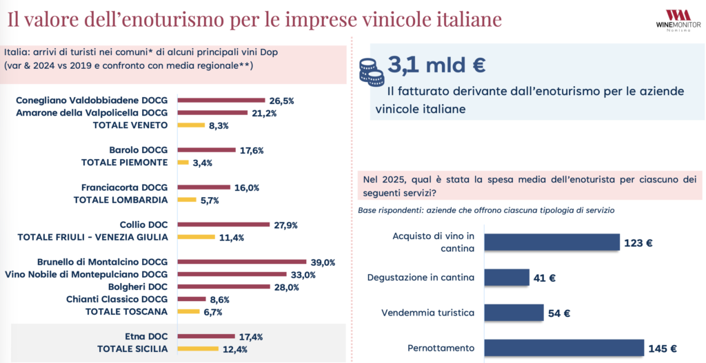In uno scenario di mercato internazionale carico di incertezze e complessità, c’è un asset che per le imprese vinicole sta sempre più assumendo rilevanza strategica per il proprio business e che negli ultimi anni è cresciuto in maniera significativa: l’enoturismo. Se guardiamo agli arrivi di turisti nelle principali zone vinicole italiane (dalla Valdobbiadene alla Valpolicella, dalle Langhe alla Franciacorta, dal Collio al Chianti) negli ultimi cinque anni si sono registrate crescite di molto superiori – in termini di variazioni percentuali – alla media della relativa regione (al netto dei capoluoghi/città d’arte). Nel caso della Sicilia, prendendo ad esempio, i comuni dell’Etna (legati cioè al disciplinare di produzione dell’Etna Doc), tra il 2019 e il 2024 gli arrivi di turisti sono cresciuti del 17,4% contro una media dell’intera isola del 12,4%.