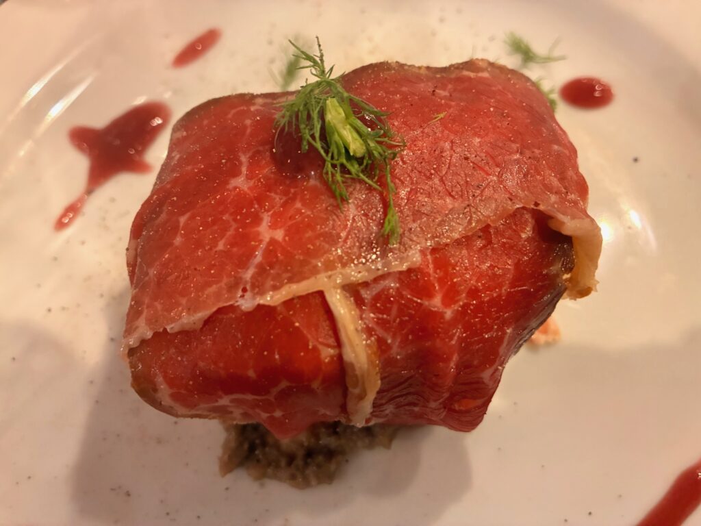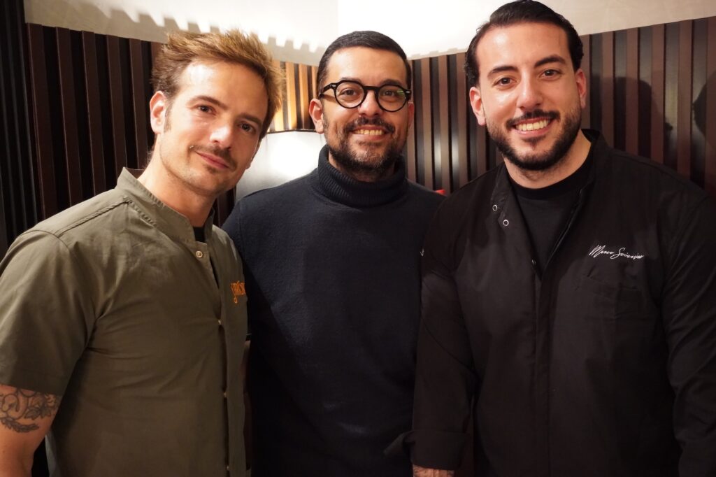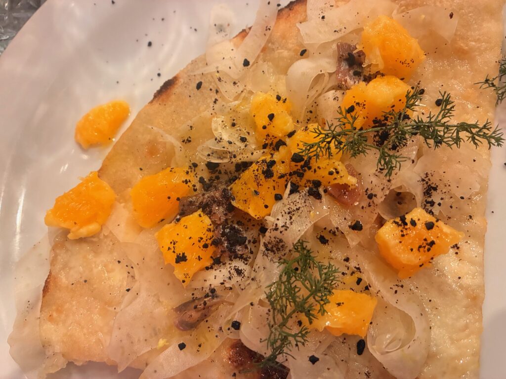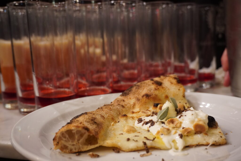 Il percorso si è aperto con Ricordo di Wellington, una nuvoletta di pasta fritta ripiena di crema di funghi, laccata con senape delicata, bardata con carpaccio di Black Angus affumicato al faggio, riduzione di Nero d’Avola e tartufo nero in scaglie, accompagnata da Invite, aperitivo a base di rosolio di bergamotto, aperitivo al pane raffermo, succo di cedro e CO2. Si è proseguito con Finocchio & Arancia, pizza sottile e croccante da 180 grammi che omaggia la tradizione romana, con fiordilatte campano, Tuma Persa, carpaccio di finocchio al pepe timut, acciuga di Aspra, polvere di olive, arance siciliane e finocchietto, abbinata a 1861, cocktail a base di Americano Savoia, tintura al Parmigiano Reggiano 24 mesi e soda all’origano.