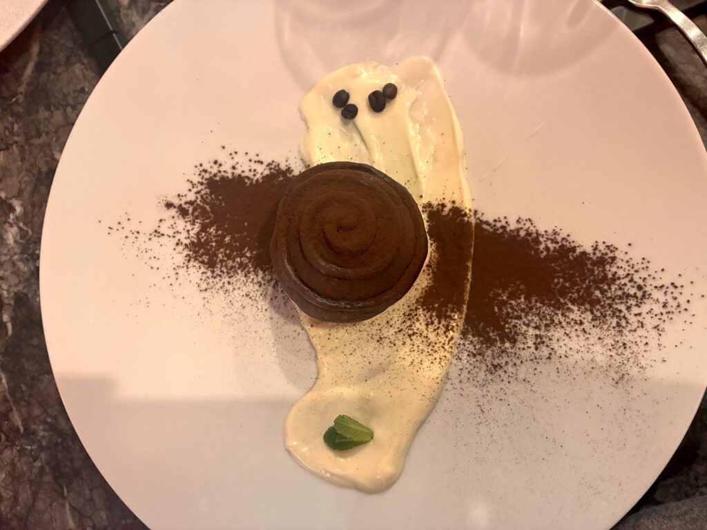 Poi è stato il turno di Tartufo e Latte, pizza tonda realizzata con farine macinate a pietra e grano parzialmente germogliato, fior di latte campano in acqua, stracciatella di bufala, tartufo nero, burro montato al Parmigiano, salvia e nocciole tostate, servita con Fluffy Garibaldi, spremuta di arancia siciliana, bitter, lecitina di soia e arancia bruciata. In chiusura Un Cappuccino in Veneziana, brioche con farina di tipo 1 e note di cacao, ripiena di crema al cappuccino, polvere di cacao e chicco di caffè, accompagnata da Cotone, cocktail a base di tequila, mezcal, tè oolong essiccato con vapori di latte e pompelmo rosa.