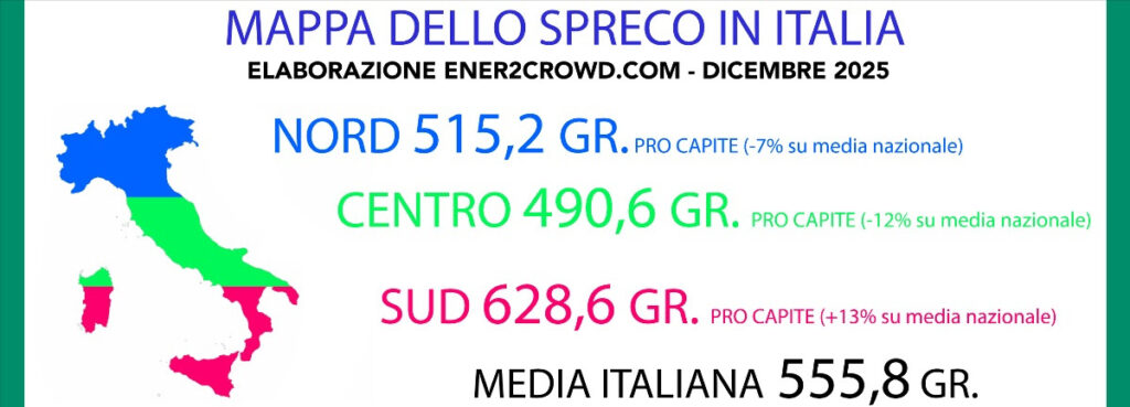 Lo spreco alimentare in Italia non è uniforme e disegna una vera e propria frattura territoriale. «Nel Nord Italia lo spreco domestico medio settimanale pro capite è di 515,2 grammi(–7% rispetto alla media nazionale), nel Centro scende a 490,6 grammi (–12%), mentre nel Sud sale a 628,6 grammi, +13% sopra la media» sottolineano gli analisti di Ener2Crowd.