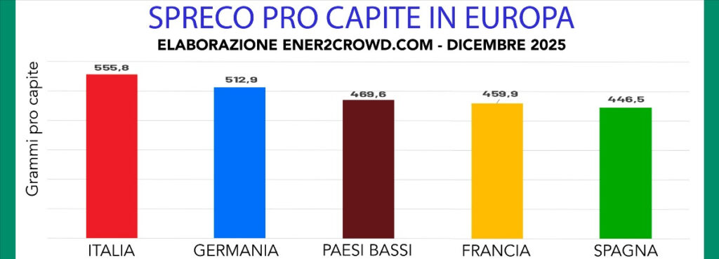 Lo spreco alimentare domestico resta un problema diffuso in tutta Europa, ma l’Italia si colloca sopra la media dei principali Paesi UE. «Lo spreco medio settimanale pro capite è pari a 555,8 grammi in Italia, contro 512,9 grammi in Germania, 469,6 nei Paesi Bassi, 459,9 in Francia e 446,5 in Spagna» osservano gli analisti di Ener2Crowd, la piattaforma ed app per gli investimenti ESG, riferendosi ai dati Waste Watcher International, International Center for Social Research ed Eurostat.